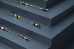 Collar de lineas ultra simples, hilo metalico color gold con dos cristales en detalle central. Viene en color cristal, negro, nude, azulino y verde.